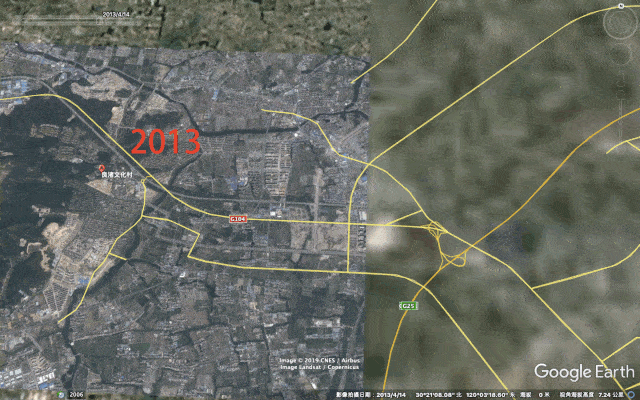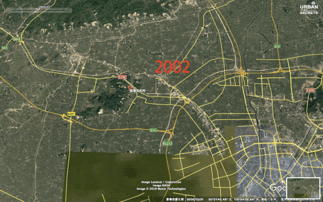 2002-2012年时地图上的文化村,可以看出文化村和良渚镇的快速发展
